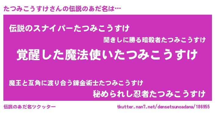 | 男性向けラノベタイトル風あだ名 | 『たつみこうすけの嫁は女の子じゃないと思った?』 |