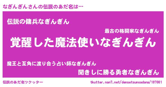 | 男性向けラノベタイトル風あだ名 | 『Re:なぎんぎんから始める異世界生活』 |