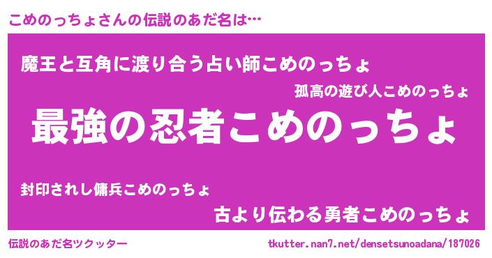 | 男性向けラノベタイトル風あだ名 | 『こめのっちょに滅ぼされるだけの簡単なお仕事です』 |