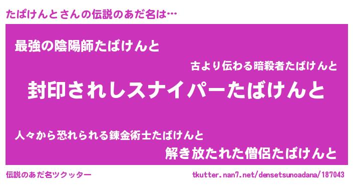 | 胡散臭い通販商品みたいなあだ名 | 『億万長者になれる霊験あらたかなお札…その名も「たばけんと」』 |
