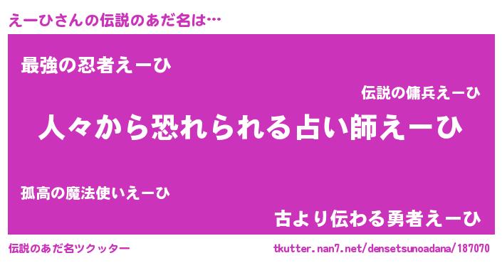 | ヒーロー風カッコイイあだ名 | 『正義の使者えーひ』『最強戦士エーヒ』 |