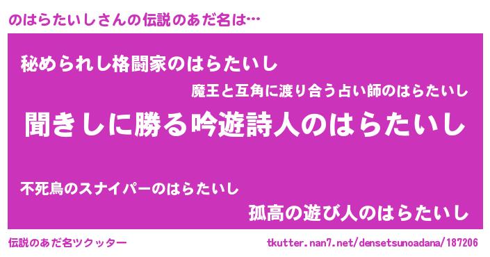 | 男性向けラノベタイトル風あだ名 | 『ノハラタイシスレイヤー』 |