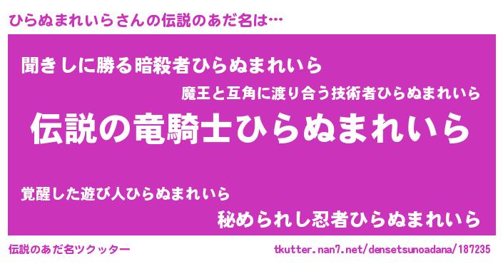 | 意味不明あだ名 | 『自称ひらぬまれいら』 |