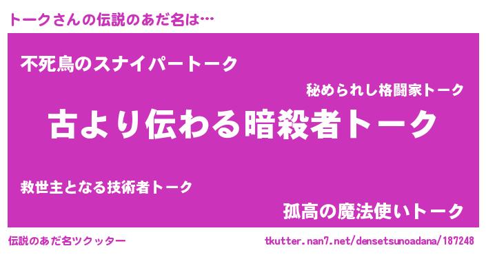 | 女子向けラノベタイトル風あだ名 | 『トークの契約王妃』『闇のトーク』 |