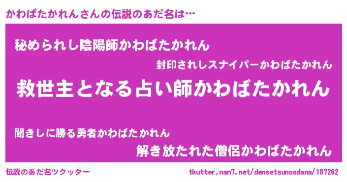 | 男性向けラノベタイトル風あだ名 | 『かわばたかれんに滅ぼされるだけの簡単なお仕事です』 |