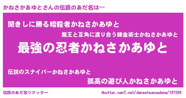 | ヒーロー風カッコイイあだ名 | 『仮面カネダー』『ネオカネサカアユト』 |