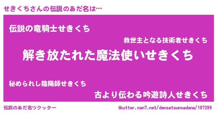 | 男性向けラノベタイトル風あだ名 | 『せきくちに滅ぼされるだけの簡単なお仕事です』 |