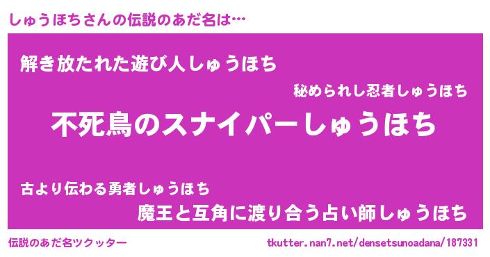 | 男性向けラノベタイトル風あだ名 | 『この素晴らしい世界にしゅうほちを!』 |