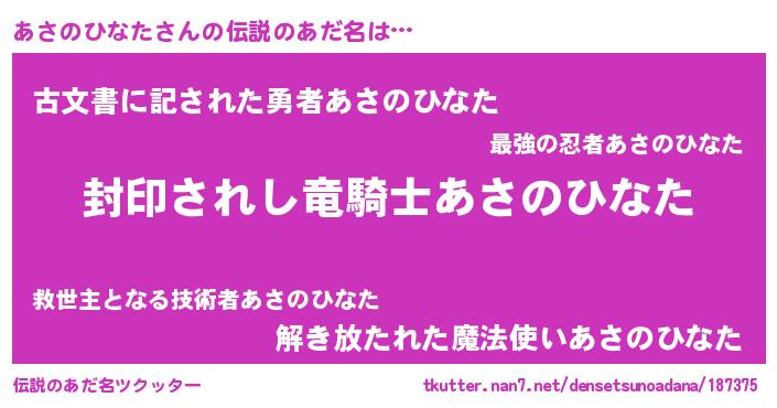 | 男性向けラノベタイトル風あだ名 | 『アサノヒナタアートオンライン』 |