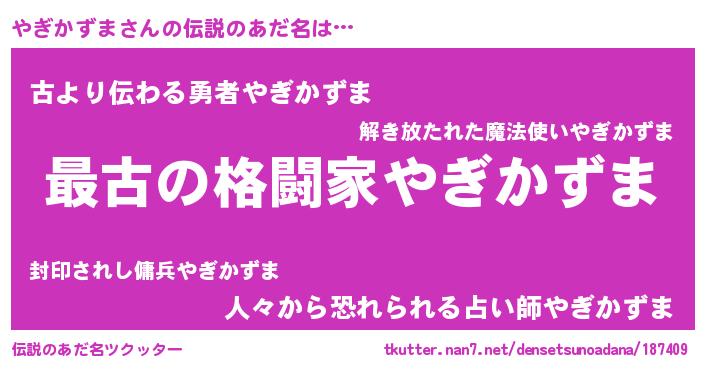 | ファンタジー風あだ名 | 『ゼヤギトゥ』『エターナルヤギカズマー』 |
