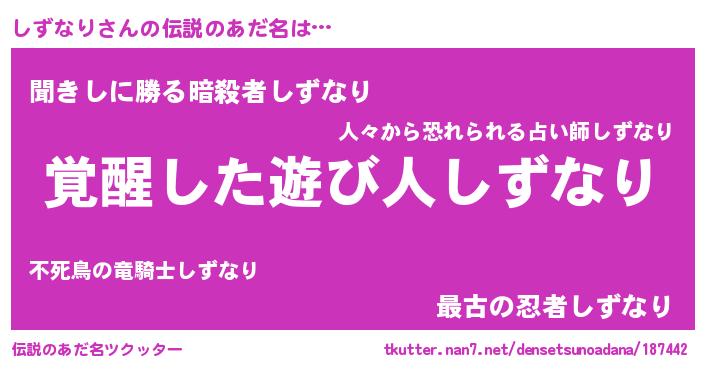 | ヒーロー風カッコイイあだ名 | 『天弓騎士シズ』『超時空戦士シズナリ』 |
