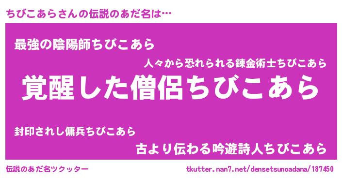 | 男性向けラノベタイトル風あだ名 | 『ちびこあらに滅ぼされるだけの簡単なお仕事です』 |