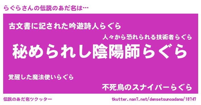 | ヒーロー風カッコイイあだ名 | 『ウルトラらぐらマン』『ネオラグラ』 |