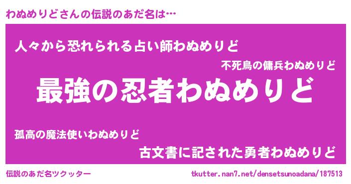 | 男性向けラノベタイトル風あだ名 | 『わぬめりどに滅ぼされるだけの簡単なお仕事です』 |