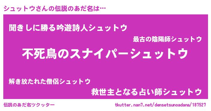 | 意味不明あだ名 | 『ペロリンシュットウ』『自称シュットウ』 |