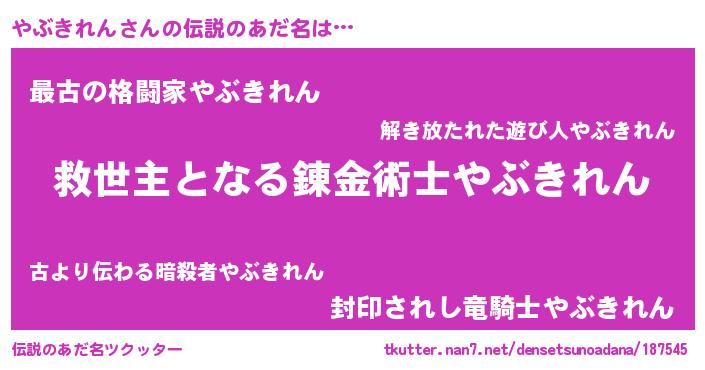 | 女子向けラノベタイトル風あだ名 | 『死神やぶきれんの再婚』 |