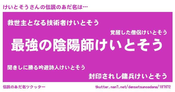 | ヘコむあだ名 | 『酢こんぶ』『けいにゅー』『けいを』 |