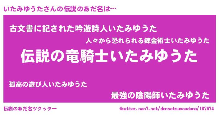 | 男性向けラノベタイトル風あだ名 | 『いたみゆうたの憂鬱』 |