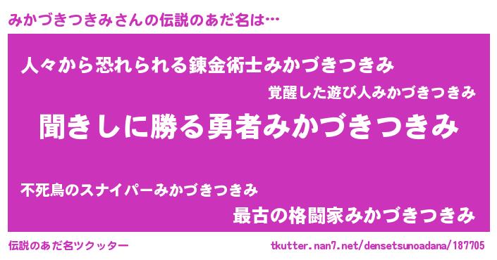 | ヒーロー風カッコイイあだ名 | 『ネオミカヅキツキミ』『炎刃騎士ミカ』 |