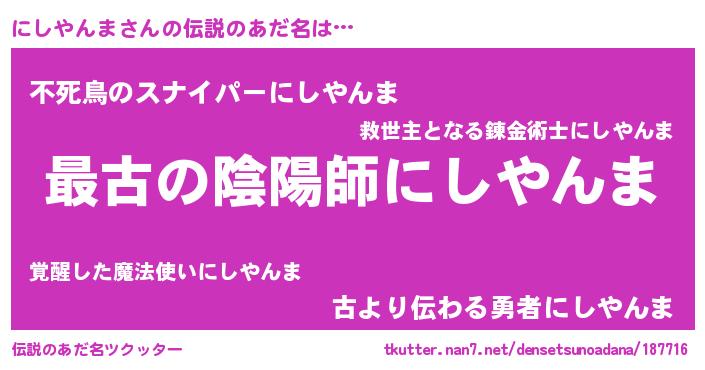 | 男性向けラノベタイトル風あだ名 | 『Re:にしやんまから始める異世界生活』 |