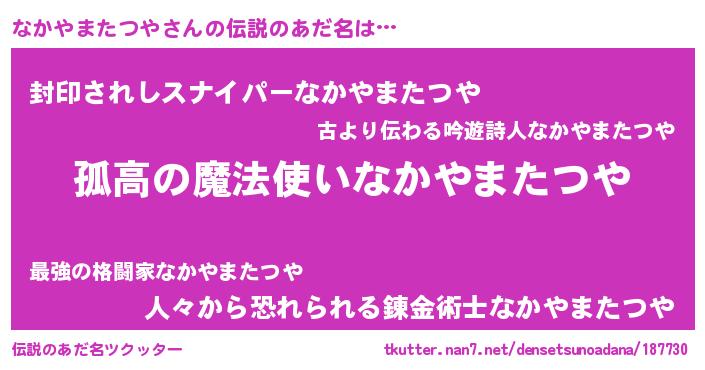 | 胡散臭い通販商品みたいなあだ名 | 『信頼と実績のサプリメント…その名も「なかやまたつや」』 |