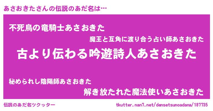 | 男性向けラノベタイトル風あだ名 | 『あさおきたという概念が存在しない退屈な世界 』 |