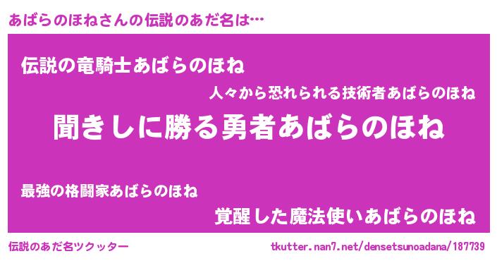 | ヘコむあだ名 | 『あばらのほね(遠い目)』『あばにー』 |