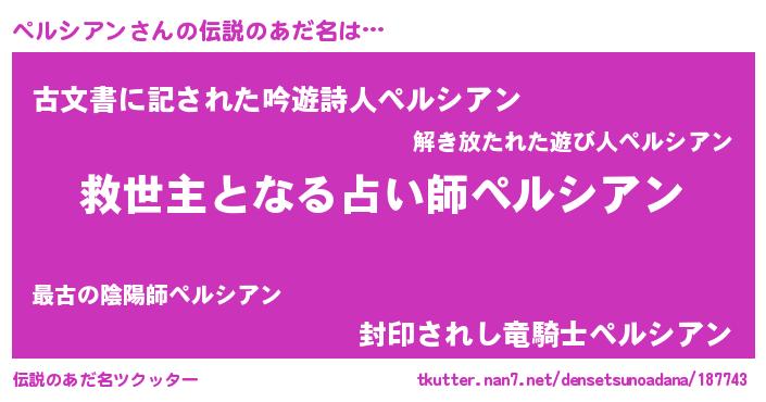 | ヒーロー風カッコイイあだ名 | 『慈愛の使者ペルシアン』『炎刃騎士ペル』 |