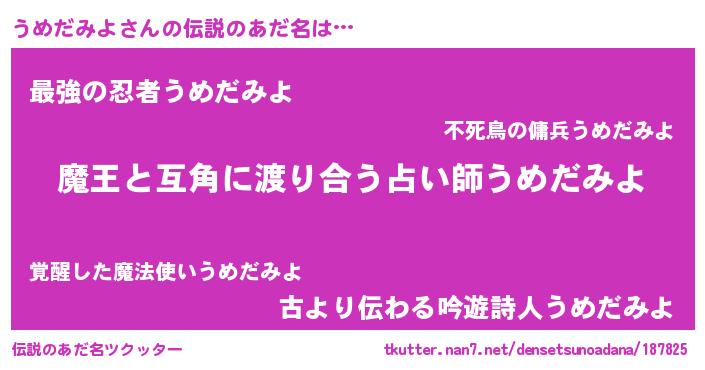 | 男性向けラノベタイトル風あだ名 | 『Re:うめだみよから始める異世界生活』 |