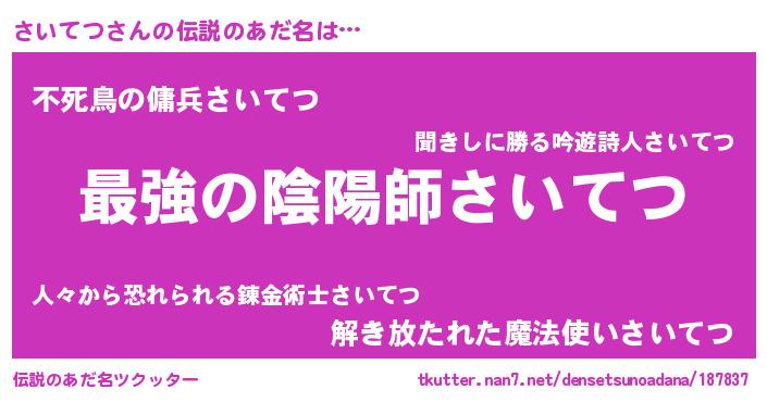 | 胡散臭い通販商品みたいなあだ名 | 『あなたにだけ特別に提供する世界で10本だけ現存している希少なブランデー…その名も「さいてつ」』 |