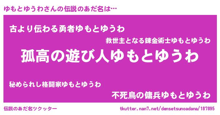 | 男性向けラノベタイトル風あだ名 | 『ダンジョンにゆもとゆうわを求めるのは間違っているだろうか』 |