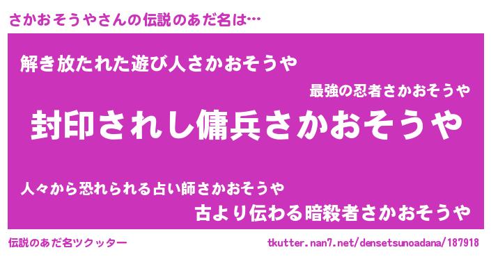 | ヒーロー風カッコイイあだ名 | 『究極戦士サカオソウヤ』『幻影騎士サカ』 |
