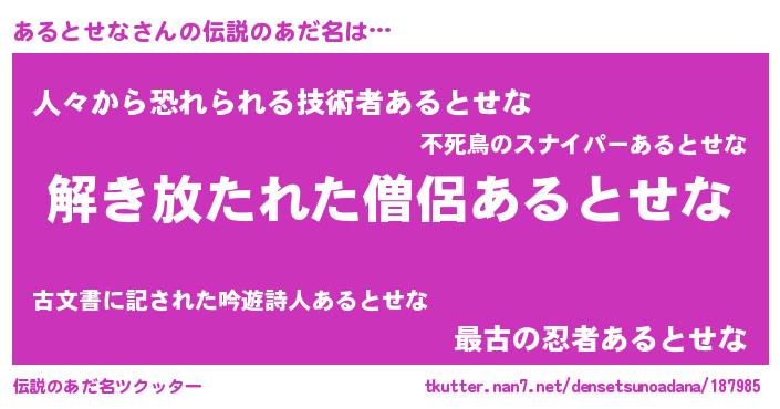 | 意味不明あだ名 | 『とにかく怪しいあるとせな』 |