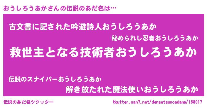 | 男性向けラノベタイトル風あだ名 | 『おうしろうあか~年齢イコール彼女いない歴の魔法使い~』 |