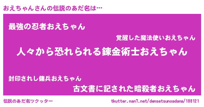 | 女子向けラノベタイトル風あだ名 | 『おえちゃんなんてお断りですっ。』 |