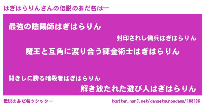 | 男性向けラノベタイトル風あだ名 | 『この素晴らしい世界にはぎはらりんを!』 |