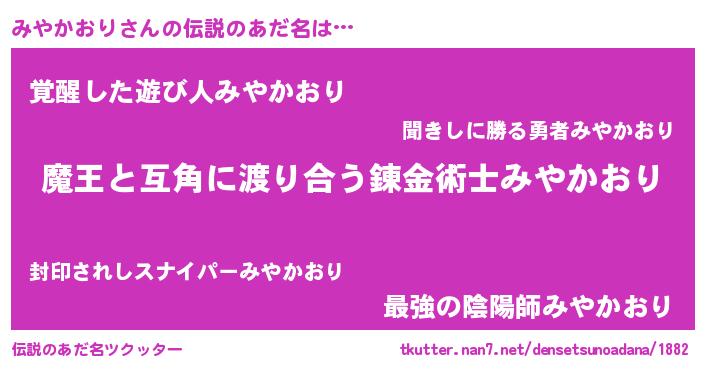| ヒーロー風カッコイイあだ名 | 『仮面ミヤダー』『天空の使者みやかおり』 |