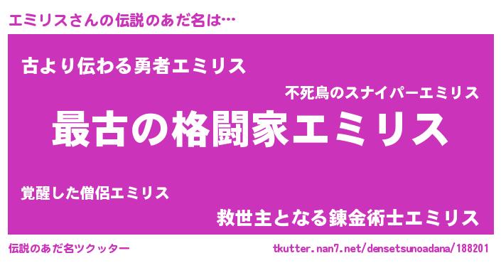 | 意味不明あだ名 | 『自称エミリス』『エミリスフォーエバー』 |