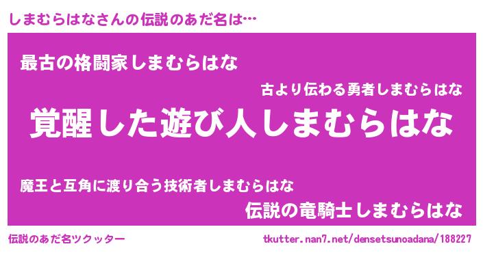 | ヒーロー風カッコイイあだ名 | 『炎刃騎士シマ』『スーパーシマムラハナ』 |