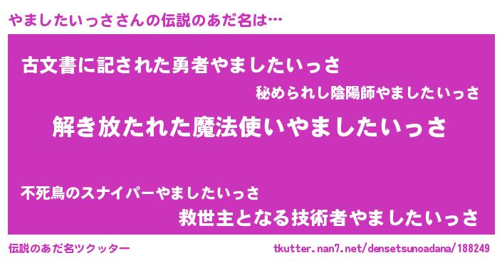 | 男性向けラノベタイトル風あだ名 | 『やましたいっさの嫁は女の子じゃないと思った?』 |