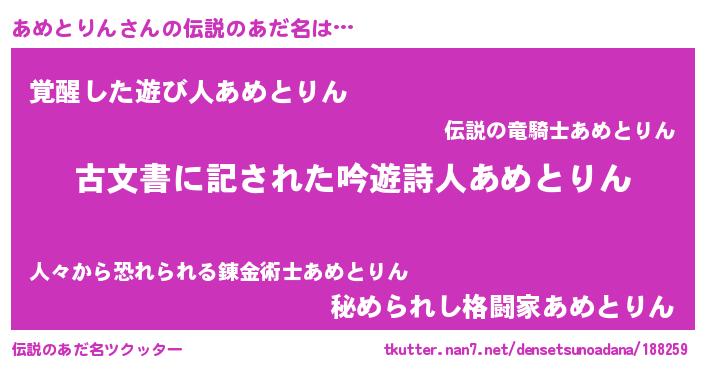 | ヘコむあだ名 | 『あめとりん(笑)』『あめぷりん』 |