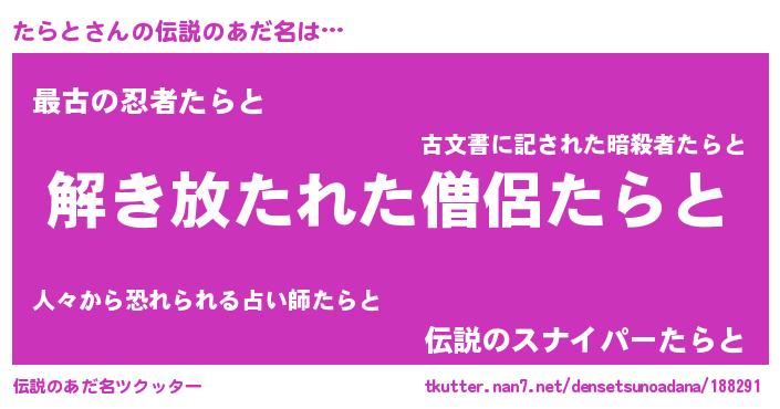 | ヒーロー風カッコイイあだ名 | 『幻影騎士タラ』『ウルトラたらとマン』 |