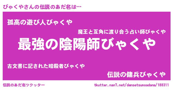 | 男性向けラノベタイトル風あだ名 | 『うちのびゃくやが世界を掌握している!』 |