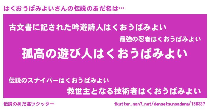 | 意味不明あだ名 | 『住所不定無職はくおうばみよい(91歳)』 |
