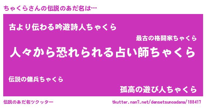 | 意味不明あだ名 | 『めかぶ科ちゃくら属』『自称ちゃくら』 |