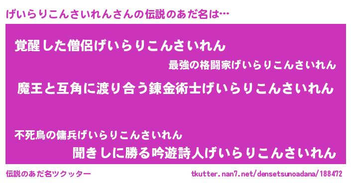 | 男性向けラノベタイトル風あだ名 | 『Re:げいらりこんさいれんから始める異世界生活』 |