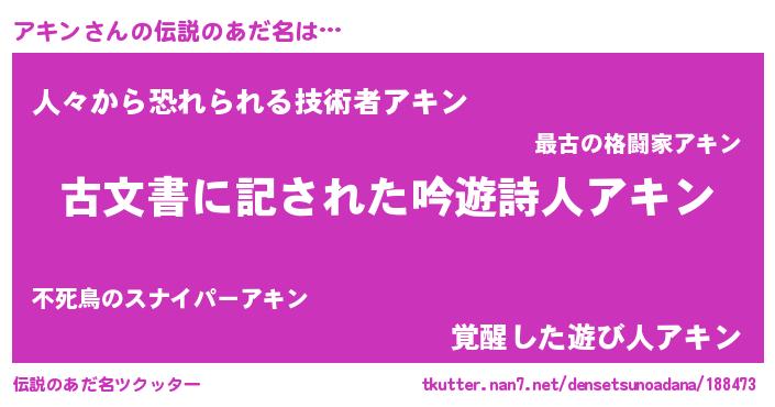 | 意味不明あだ名 | 『住所不定無職アキン(4歳)』『自称アキン』 |