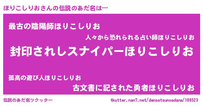 | 男性向けラノベタイトル風あだ名 | 『ほりこしりお~年齢イコール彼女いない歴の魔法使い~』 |