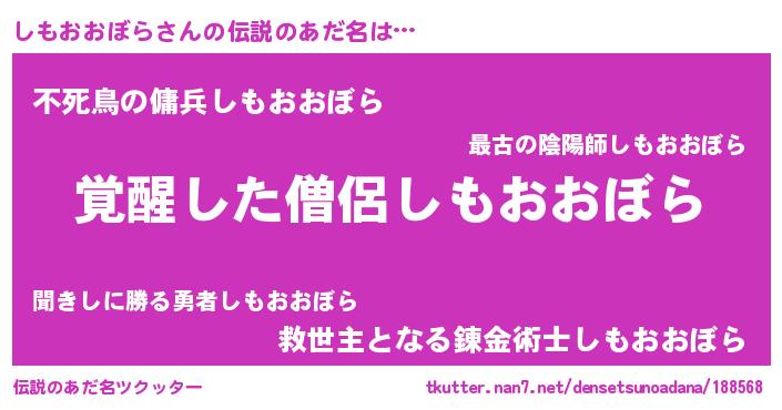 | 男性向けラノベタイトル風あだ名 | 『うちのしもおおぼらが世界を掌握している!』 |