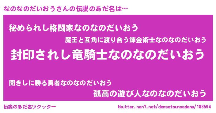 | 意味不明あだ名 | 『住所不定無職なのなのだいおう(4歳)』 |